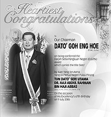 IRI President Eng Hoe Goh was well rewarded by the Penang State government on July 09, 2005 for his involvement in various charity works which improved the lives of many Malaysians. His involvement in the business sector brings revenues to the State and creates jobs for his fellow Malaysians. Dato' Goh, 52, was conferred the Darjah Setia Pangkuan Negeri (DSPN) award which carries the title of "Dato'" by the Tuan Yang Terutama Yang Di Pertua Negeri Pulau Pinang Tun Dato' Seri Utama Dr. Haji Abdul Rahman Bin Haji Abbas in conjunction with his 67th birthday. Born in 1953 in the State of Kedah , Malaysia , Dato' Goh was educated at the College of Sultan Abdul Hamid . He is the Chairman of IRM Industries Sdn. Bhd., a recycling company based in Penang , Malaysia and the President of Integrated Recycling Industries, a recycling and reclamation company based in the Philippines . Dato' Goh is the Charter President and President of Lions Club in Bayan Baru, the Deputy Chairman of the Economic Bureau in Malaysian – Chinese Association (MCA) Party. He is also a committee member of MCA. He has helped in raising fund for young cancer patients. In the Philippines , he has adopted Bahay ni Maria, a home for the abandoned aged and children in the province of Laguna and donated to thousands of victims of the 2004 landslide in the province of Quezon . The Darjah Setia Pangkuan Negeri order of chivalry was instituted in the year 1976 and is conferred on individuals of high position who have contributed unique and valuable services to the state. Person conferred with this honour carry the title Dato' and the wife Datin. This award is limited to 600 living persons, excluding non-Malaysians who may be conferred this award on an honorary basis. The insignia of this Order consists of a star, a riband, and a badge.